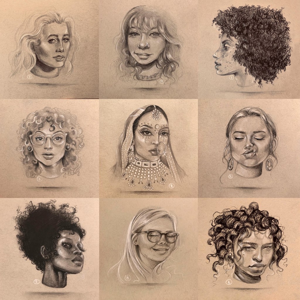 When perceiving people she notices different parts of their faces–the oddities that we may dislike about ourselves she finds breathtaking. Frederick’s portraits highlight the beauty in what we often see as flaws. Her style infuses an “other-wordly” aspect, making her work timeless and recognizable. She wants us to look at a piece and say, “hey, Jayla made that.”