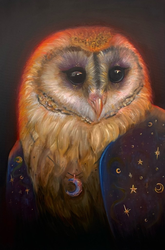 While there are various pieces to give praise to, Frederick’s standout piece, Bella Donna, a 24×36 oil painting of an owl, showcases her skill, yet I believe we’ve only glimpsed her full potential.